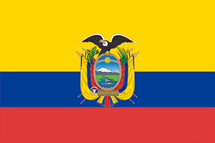 エクアドル国旗。特に額縁内の風景画やコンドルの絵柄が資料によって異なります。山はチンボラソ山、川はグアヤス川です。